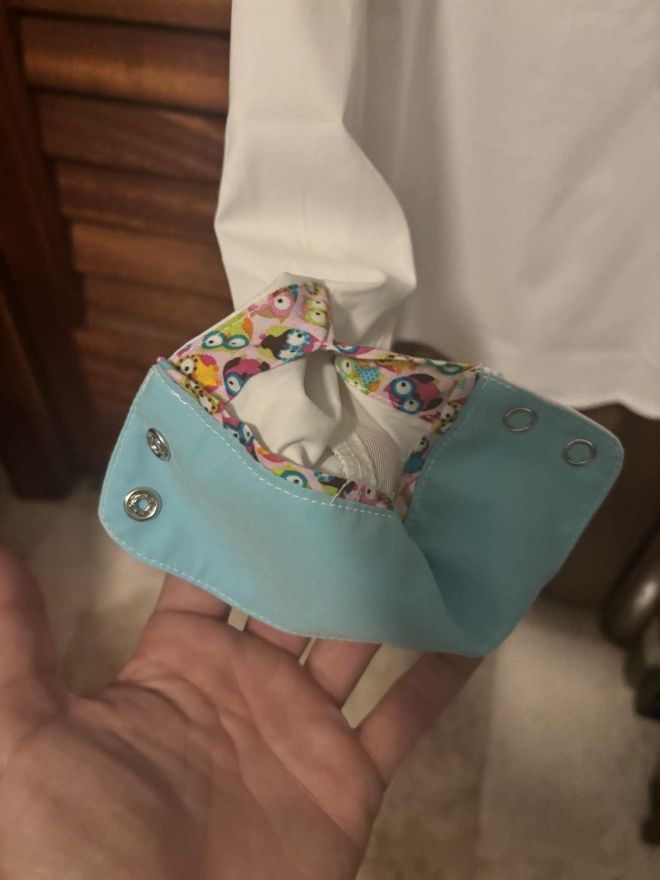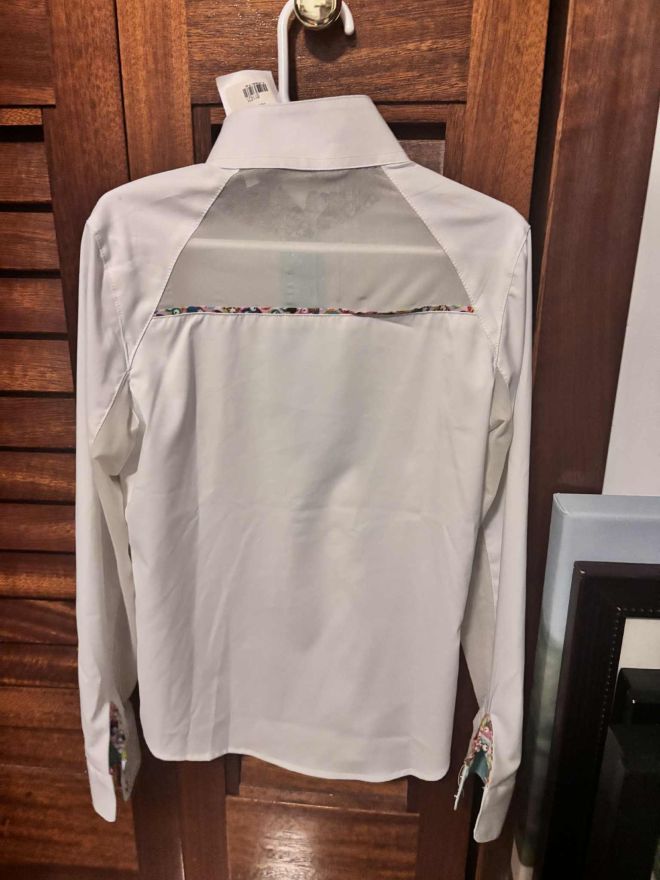 This is a KIDS white RJ Classics show shirt with mesh under arms and fun multi color owl print in collar and on cuff. Never worn, new with tags!